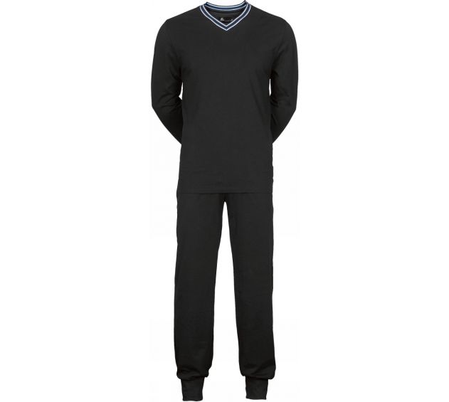 JBS klassiske sorte pyjamas er et oplagt og neutralt valg. Pyjamasen er med lange ærmer og ben. Trøjen kommer i v-hals med flotte detaljer. Sættet er fremstillet af 100% bomuld i en jersey-kvalitet, så den er behagelig at bære hele året rundt. Brug den som natsæt eller blot til afslapning.